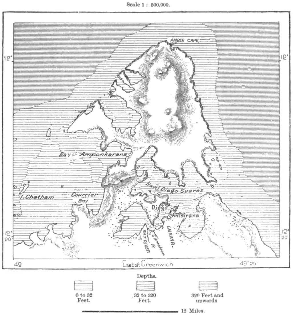 Tamatave, or Toamasina, the St. Thomas of the early Portuguese navigators, although 60 miles farther from the capital than Andovoranto, is the busiest seaport in the whole of Madagascar. At this spot the coast develops a narrow promontory projecting eastwards and terminating in a coral reef which forms the parting-line between e northern and a southern bay. The former is further sheltered from the surf and breakers by another barrier reef, which stretches for