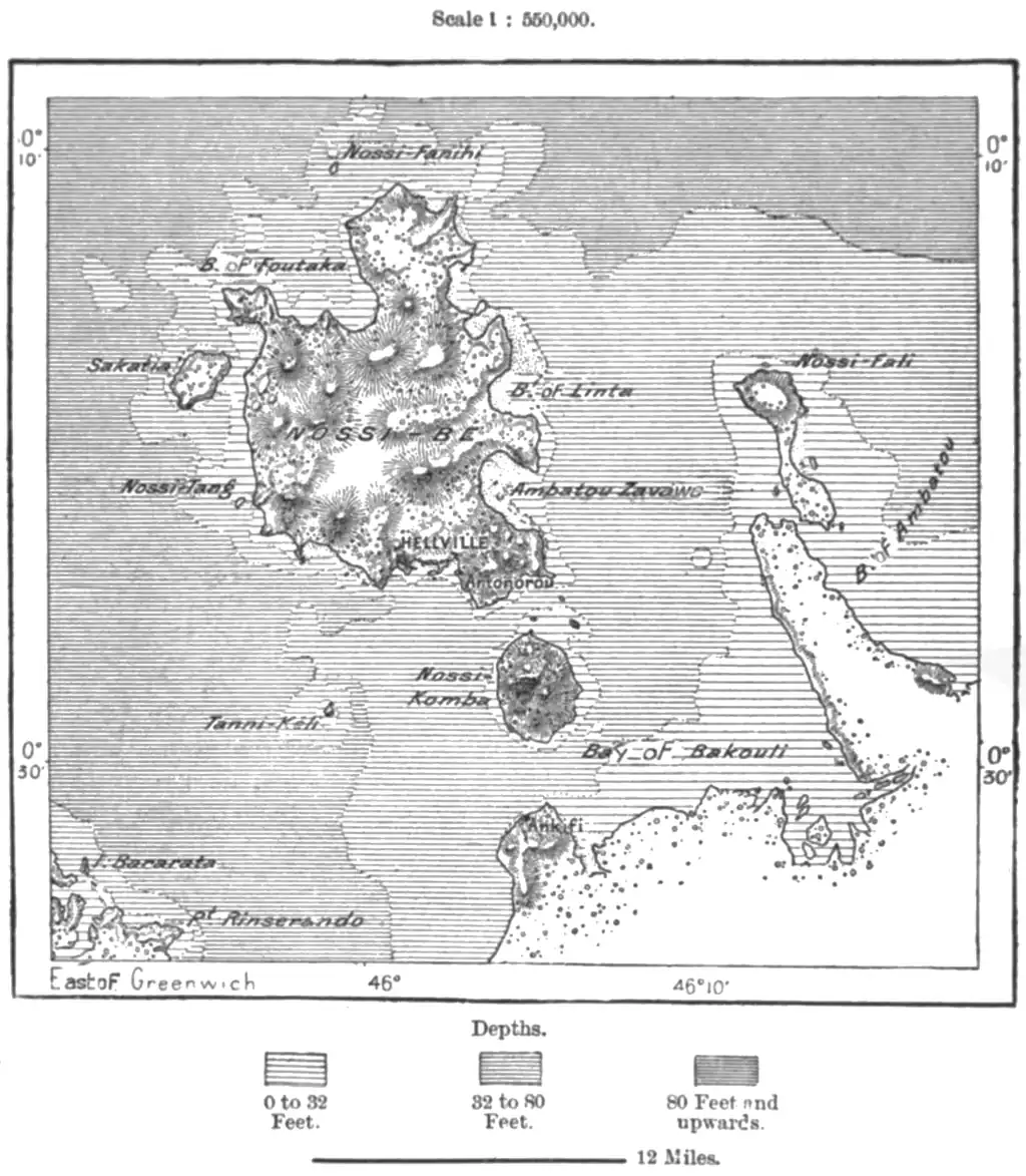 By the treaty of 1885, this inlet was ceded to France, which has made it a harbour of refuge and a victualling station for its navy. The whole basin, about two miles broad, is divided by the islet of Nossi Volane into two secondary harbours, approached by a channel from 20 to 25 fathoms deep and ramifying in all directions for many miles inland. The south-western branch is no less than