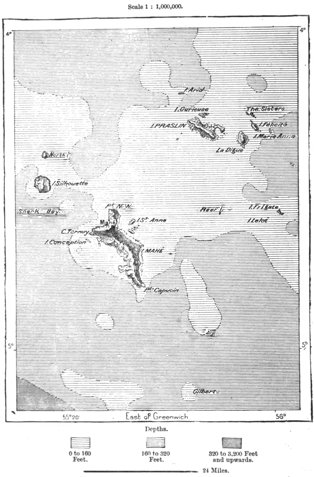 Scychellarum), whose fruit, however, ripens only in the two islands of Praslin and Curieuse. This fruit, consisting of two nuts in a single case, remains fresh for months, and is thus often borne by the currents to the coasts of India, and even