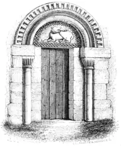 West Door, Penmon. but the central tower still remains. The south transept was used as a chapel, and a curious series of small circular-headed arches, with zigzagged mouldings and filleted shafts, formed seats round its sides for the monks and their attendants. The buildings are in good preservation, though somewhat in need of repair; but they belong to a gentleman of enlightened taste and public spirit, Sir R. W. Bulkeley. The chancel only is used as a parochial church.