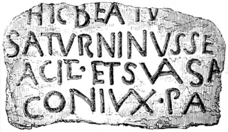 HIC BEATVS SATVRNINVS SEPs (SEPULTUS) JACET' ET SVA SCa (SANCTA) CONJVX' PAX.