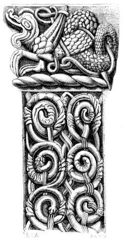 No. 2. First Pillar on the left of the large Arch of Shobdon Church. Two tympanums, each adorned with very bold and fine bas-reliefs, are also preserved, but they do not appear to belong to the two smaller arches, if we may judge from their present appearance. That on the right of the larger arch is represented in the cut (No. 1.) at the head of this article; it represents the Deity, seated within a round aureole or glory, supported by four angels. The left tympanum contains an allegorical group of figures. The pillars supporting the arches display an extraordinary richness of ornament, of the character of which some idea may be formed from the fragments given in our woodcuts: it consists of figures of men, animals, dragons, foliage gracefully arranged, elegant knotted work, and various kinds of tracery. Our specimens are all taken from the shafts of the middle or chancel-arch, which is supported by three pillars on each side. The first or outer pillar on the left-hand side (part of which is represented in the cut No. 2.) is a slender shaft of scroll-work, with a capital, on which is sculptured the dragon, which occurs so frequently in Anglo-Saxon and Anglo-Norman iconography. The next pillar (No. 3.) is ornamented with figures of men supposed to represent Welsh knights, arranged in couples and interwoven with tracery. Similar figures are found among the sculptures on the south door of the church of Kilpeck[1] on the southern