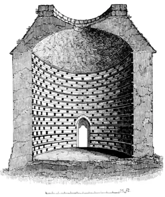 "The wall is of stone, and four feet in thickness, with twenty-one ranges of holes for pigeons. The holes are made wider within the wall by cutting away the stones which form the surface. On inserting the hand into one range of holes, they would be found to open to the left, while the range above would be reversed. The building is further strengthened by a course of solid stone between every two ranges. The house is covered by a vaulting of stone, presenting a concave surface internally and externally. A circular opening in the centre of the vaulting affords the means of ingress and egress to the pigeons, while two doors, at the north and south, give the same facilities to unfeathered bipeds. The noble owner (Lord Southwell) has recently substantially repaired the wall, but it is very much to be desired that the roof should be replaced, for the concave form of the vaulting facilitates the effects of the weather, and allows the rain to find its way freely through the vaulting.