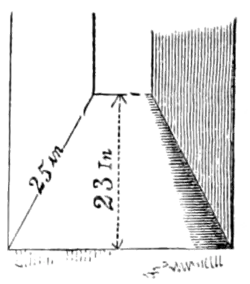"On the opposite side of the cellar, that is, the eastern one, are four square recesses, which are situated 2 feet 10 inches above the floor, and in a line nearly corresponding in position with the arches on the other side. They are 15 inches wide by 10 deep; from the surface of the wall to the back of each recess is 11 inches. The bottom of each recess has been covered with a large tile. There are three hollows, of less size and irregular shape, higher up in the wall, but they may have been made by accident. On measuring the dimensions of the cellar, I found them to be as follows: length from north to south, 9 yards 29 inches; breadth from east to west, 4 yards 32 inches. It is almost exactly two cubes.