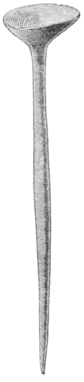 Of other ornaments found on the island on Lough na Glack, I may particularly mention several amber and blue glass beads, three bone pins, and a comb apparently of ivory. Of iron instruments, an iron dagger, measuring with the hilt fifteen inches; several iron coulters of ploughs, of very primitive form, seven inches in length; parts of iron instruments, the use of which it is impossible to determine; a long gun barrel, three feet eight inches in length, of that sort, I believe, formerly called a calliver; part of the lock of a pistol; many large bullets of lead were also found; I may add to this list a pair of quern stones, found in the Monalty Island, some burnt corn, the refuse probably of the primitive thrashing and winnowing of the ancient Irish, which consisted in merely setting fire to the corn when reaped; remains of coarse broken earthenware vessels, and bits of thick dark glass; an earthen pot, shaped like a hat; another of Dutch