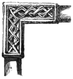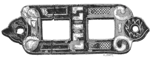 An ornament of mixed metal, here represented, from a beautiful drawing by Mr. Digby Wyatt. It is very curiously inlaid with enamel of red and brownish yellow colours. It exhibits, also, specimens of a remarkable glass-mosaic, in chequered work of blue and white, incrusted in cavities chiselled out on the face of the metal. This kind of ornament is formed occasionally on ancient Irish works in metal; it bears much resemblance to some antique ornaments discovered with Roman remains; it occurs on the curious bronze basin found in the bed of the River Witham, near Lincoln, and exhibited in the Museum formed during the meeting of the Institute in that city. That remarkable object is now in the possession of Mr. Hawkins, of Bignor Park, Sussex.