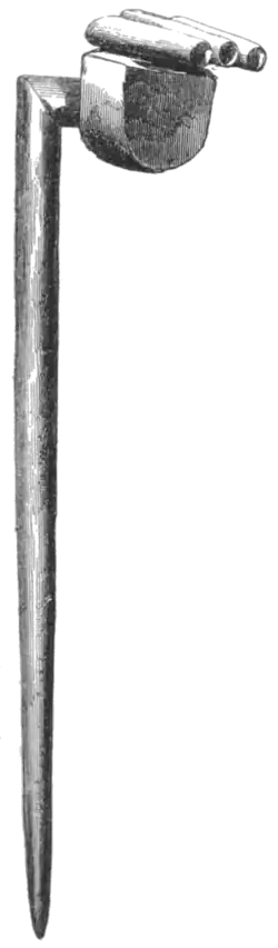 An object of unknown use, conjectured to have served as the arms of a balance? In one part it is ornamented with a beautiful chased design, once, probably, enamelled. (See cut. Orig. size.) Several bronze pins of various fashion and size, from 3 to 6 inches in length. Four, of these have moveable rings appended to one extremity, in lieu of a head: a similar ringed pin may be seen in the Museum of the Institute, presented by Mr. Evelyn Shirley, and found in the Co. Monaghan. Another pin has a head of very singular fashion, as shown by the representation here annexed, of the same size as the original. This peculiar little ornament may claim