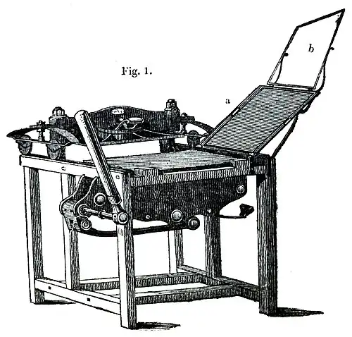 than one half of a large sheet could be printed at one descent of the screw. A most serious evil results from this, especially in printing duodecimo, because the pressure necessarily is applied twice to the centre pages of each sheet, while it is applied only once to the other pages. To these disadvantages may be added, the difficulty of ascertaining and regulating the degree of pressure; the irregularity of the motion of the lever; the severe labour, and excessive exertion of the workman; the nice accuracy in placing the types under the centre;—there being no difference, in point of trouble and labour, in printing a card and a folio;—and the necessity for placing small work always in the same spot, which necessarily wears out one part sooner than the others. In obviating these defects, Mr Ruthven has completely succeeded;—and after giving some account of the construction of the new printing press, we shall point out the superior excellencies of it as briefly as possible.
