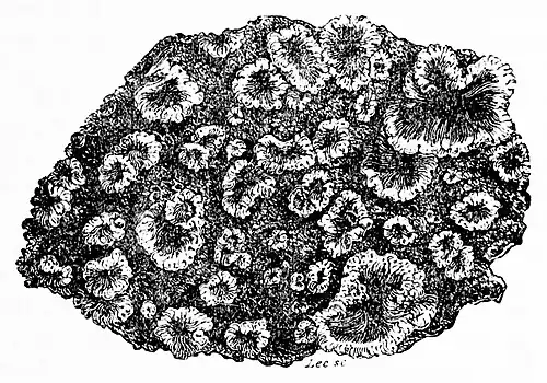 the thin white coating on these rocks. The branching bodies so closely resembled in general appearance certain nulliporæ (a family of hard calcareous sea-plants), that in lately looking hastily over my collection I did not perceive the difference. The globular extremities of the branches are of a pearly texture, like the enamel of teeth, but so hard as just to scratch plate-glass. I may here mention, that on a part of the coast of Ascension, where there is a vast accumulation of shelly sand, an incrustation is deposited on the tidal rocks, by the water of the sea, resembling, as represented in the woodcut, certain cryptogamic plants (Marchantiæ) often seen on damp walls. The surface of the fronds is