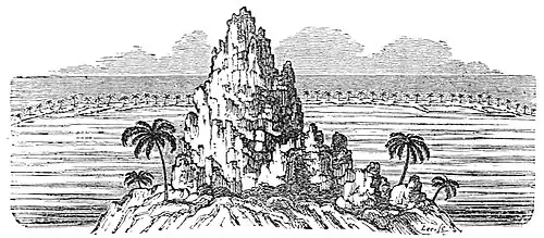 a broad and rather deep channel of water, analogous to the lagoon within an atoll. It is remarkable how little attention has been paid to encircling barrier-reefs; yet they are truly wonderful structures. The following sketch represents part of the barrier encircling the island of Bolabola in the Pacific, as seen from one of the central peaks. In this instance the whole line