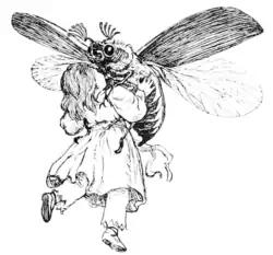 Just then a big cockchafer came flying past and saw her; the next moment he had caught hold of her round her slender waist with his claws and flew up with her into a tree, while the green leaf floated down the stream and the butterfly flew with it, for he was fastened to the leaf and could not get away.