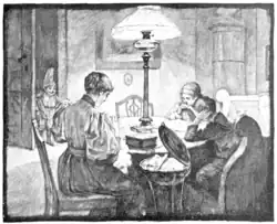 When it is getting near bedtime, and the children are sitting comfortably round the table or on their little footstools, in comes Daddy Dustman. He comes so softly up the stairs, for he walks in his stocking-feet. He opens the door quietly, and, whist! he squirts sweet milk into their eyes, so little, oh, so very little, but always enough to prevent them from keeping their eyes open, and that's why they cannot see him. He steals up behind them, breathes gently on their necks, and this makes their heads heavy. But it does not hurt them, for Daddy Dustman means well