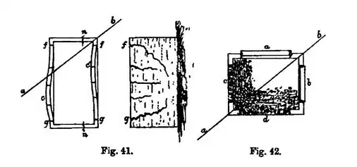 When the building is rectangular, and the abnormal wave in the direction to , Fig. 41, arrives first at one of the long side walls, making an angle of 45° less, with the end walls, the latter are generally fissured vertically at, but the long side walls are also bowed, or possibly prostrated; the greatest amount of curvature being at and , and the fissures taking the hollow curved forms, seen in the elevation of the wall , the central fissures, being secondary or sub-fissures, dependent upon the bowing.