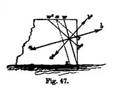 For referring to Fig. 47, if , be the path of emergence, referred to one of the walls, and , be the line of fracture therein corresponding, then as the mass thrown out is greater, as the velocity is so, and as the angle of fracture with the quoin is constant, while the emergence is so, it follows that if the velocity be reduced, the fracture will be somewhere as at , still parallel to , but higher up, and vice versa, and so for any other emergence: but if the velocity being the same, the angle of emergence vary, then, in order that the line of fracture may still continue perpendicular thereto, the point must ascend or descend along the quoin as with the path , producing the line of fracture , which, when it makes a very acute angle with the quoin, and therefore the angle of emergence small, and the velocity also great, may even follow back along the wall as to , so that the point , would fall below the base of the wall, if the lines of the fractures were produced.