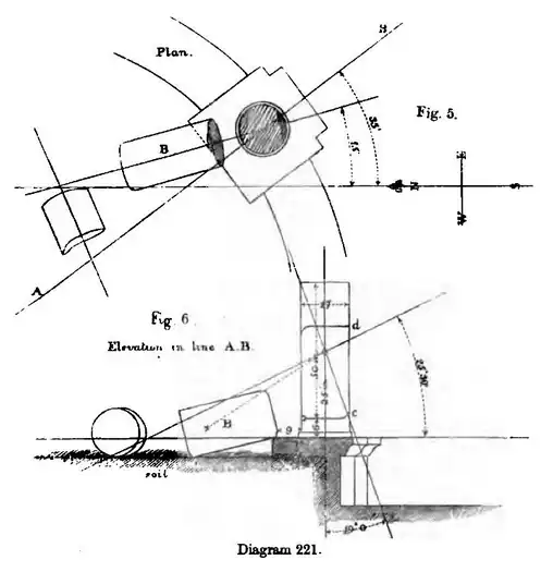 been overthrown by the shock, and lay as in Figs. 5 and 6, Diagram 221, and as shown in Photog. No. 217, having never been moved or meddled with, the garden being an enclosure, since the earthquake. The lower and longer block was, at its lower end, within 9 inches of the stump of the shaft. The top block had been thrown over along with the one below it, had separated on striking the ground, at the top part, as the position of the other piece and the lower level of the soil than the stone base (Fig. 6) proved, and had slewed round and rolled a little off. The longer piece remained