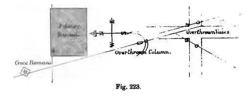 It will be seen, on looking at Fig. 3 (Diagram No. 222), that the vase might have been thus tilted upon its own base at the joint , to the extent of nearly 22° 30′, before it would have lost the power of recovering its position, and that when tilted through part of this angle, the effect of the throw of the second shock delivered to it through the base, would tend to increase the rotation commenced, as well as to diminish the extent of horizontal range, or velocity impressed.