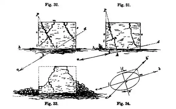 mitted diagonally in the direction through the side walls, fracture occurs in jagged lines in directions perpendicular to , the wave-path. The fissures at the end , therefore, commencing at top, very near the internal angles of the quoins, run down in the direction , making an angle with the plumb line of the wall (before disturbance) = the angle of emergence.