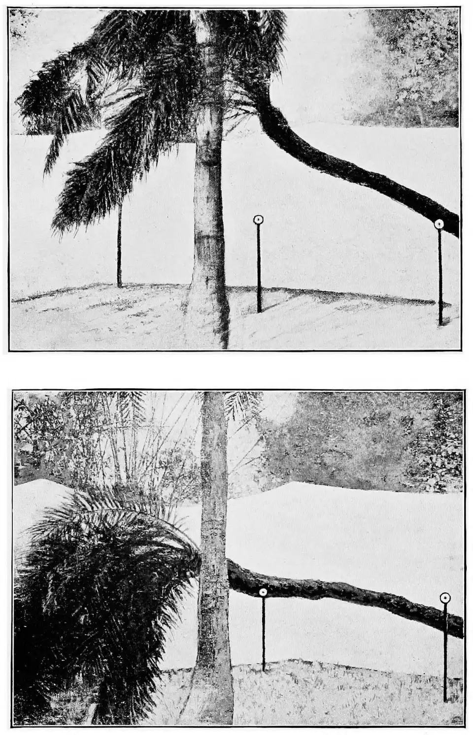 Fig. 1. The Faridpur 'Praying' Palm: the upper photograph shows position in the morning; the lower position in the afternoon. The two fixed stakes are one metre in height. In front is seen erect trunk of a different Palm.
