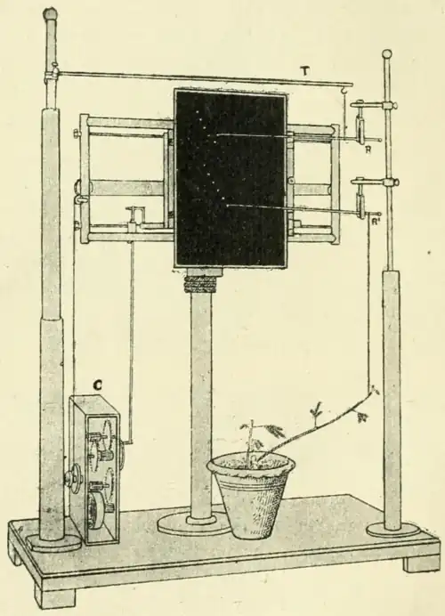 the movement of the palm tree, a reducing device is employed to keep the record within the plate. A lever, R¹, records the movement of the attached tree or plant on a moving plate of smoked glass. The plate is not in contact with the