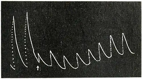 Fig. 19. Effect of enhanced turgor, artificailly induced. First two responses normal. Application of water, at arrow, induces depression of moto-excitability.