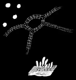 Fig. 7.—Arcyria punicea. Detail and spores highly magnified. are not it. They seem rather to represent an independent twig near the base of the great tree of life, a branchlet whose departure was absolute as ancient, developing with no respect to any other organic thing, and soon reaching the limit of that particular possibility. Perfect in themselves, we may look for nothing further in that direction. Nature herself has written, "No thoroughfare."