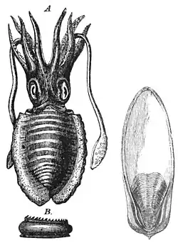 Fig. 1.—Cuttle-Fish (Sepia officinalis) and Shell. little resemblance to its relatives, oysters and clams, that an average observer would be far more likely to place it among the true fishes. It has large, prominent eyes, and its mouth is armed with a horny beak, very much like a parrot's bill. With this it undoubtedly proves itself a dangerous enemy to many marine animals. Forward motion is obtained by a fin-like tail, while it moves backward by suddenly forcing water out of a bag having its opening near the creature's mouth. Ten arms or feelers, with their inner surfaces lined with suckers, are arranged about the mouth. Although it seldom grows over a foot long, an embrace from its arms is painful. How much more so must it be in the case of the large octopus, or devil-fish, of the North, which is often forty feet in length, measured from the tips of the two long arms! In this latter animal the suckers are sometimes two inches in diameter, and, when worked by the powerful muscles, painful wounds can be produced. From earliest times fabulous accounts of a creature like this have been circulated,