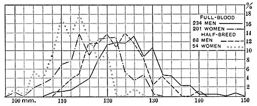 The relation of the three groups remains unchanged throughout life. The amount of white and Indian blood in the mixed race is very nearly the same. We find, therefore, the remarkable fact that the Indian type has a stronger influence upon the offspring than the white type. The same fact is expressed in the great frequency of dark hair and of dark eyes among half bloods.