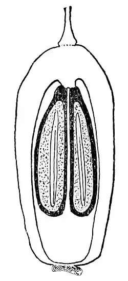 Fig. 20.—Berberis vulgaris. Vertical section of berry, showing two seeds, each containing copious reserve food and a long, well-developed embryo. malic acid, a substance found also in the foliage. Besides being made into preserves and jellies, the ripe fruit is candied or may be dried like raisins. While yet green the berries are sometimes pickled as a substitute for capers. Barberry preserve is, moreover, often used as the basis of a refreshing summer drink—a sort of "barberryade." Finally, it is reported that in our Western States the fruit of Berberis aquifolium and certain other native species is made to yield upon fermentation an agreeable wine.