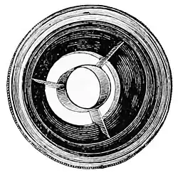 Fig. 19.—Section of Nozzle showing Ring. The larger nozzles are sometimes provided with an inner tube that will make a division in the stream, and therefore tend to close the stream on itself and prevent spraying. In some cases the nozzle is divided into sections to destroy the revolving motion of the stream, and one nozzle is made with a small hollow tube in the center. The stream having an air space, closes upon it and hangs together for a longer time. The solid body of the noz-