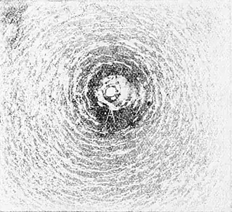 The adjacent figure is from a photograph of iron filings spread over a plate through which a wire is thrust, perpendicular to the plate. A current is passing through the wire whose cross-section