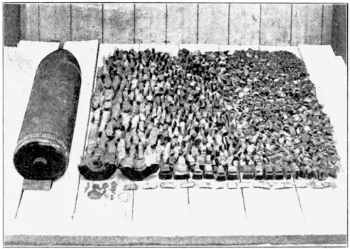 The accompanying illustration. Fig. 1, shows the shell before exploding. On the right of the shell are 7,000 fragments which were recovered. It will he observed that the fragments do not have the