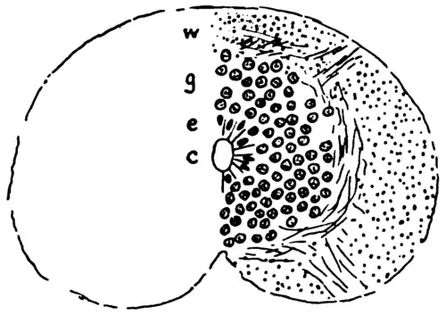 Fig. 5. Transverse Section of the Spinal Cord of a Vertebrate (Salamander), c, central canal; e, epidermis; g, gray substance composed of ganglion cells and neuropile; w, white substance or nerve-fibers.