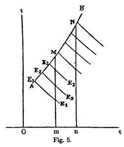 distinctly visible. The line of liquidity is a curve (fig. 5) determined by the relation between and . This curve is also an isometric. Every point of it has a definite volume, temperature, entropy and energy. The latter is indicated by the isodynamics , , etc., which cross the region of partial vaporization and terminate in the line of liquidity. (They do not in this diagram turn and follow the line.) If the body pass from one state to another, remaining liquid, as from to in the figure, the heat received is represented as usual by the area . That the work done is nothing, is indicated by the fact that the line is an isometric. Only the isopiestics in this diagram are superposed in the line of fluidity, turnin downward where they meet this line and following its course, so that for any point in this line the pressure is undetermined. This is, however, no inconvenience in the diagram, as it simply expresses the fact of the case, that when all the quantities , , and are fixed, the pressure is still undetermined.