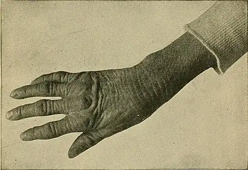 In the rugous form or stage of the disease the affected portions of skin present a dull-red, leathery appearance, with slight scaling and deep parallel furrows (see plate and Fig. 48). Upon the hands the skin sometimes becomes shrivelled and drawn to an extent which seriously interferes with the motion of the fingers (Fig. 49), while the nails show marked evidence of malnutrition. In some cases nodular ridges are found at the bend