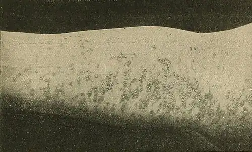 characteristic and often serves as an excellent basis of diagnosis. The lesions are at first discrete, but show a marked tendency to coalesce and form irregular or reticulate patches of varying