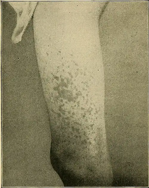 in one or two weeks, unless a fresh outbreak occurs. In this event the bright-red color of the recent spots contrasts strongly with the dull livid hue of the older lesions.
