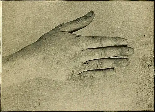 fingers, the anterior portion of the wrist, the axillæ, genitals, and ankles, and appear as small, curving dotted lines, from the extremity of which the insect may sometimes be dug out with the point of a needle. These burrows are often concealed by an eruption of vesicles, pustules, and crusted sores, and not infrequently the lesions of contagious impetigo are present. Upon other portions of the body the eruption usually consists of numerous excoriated papules covered by minute blood crusts. The anterior aspect of the forearms and the abdomen are especially apt to be the seat of the eruption, but when the disease has existed for several months the eruption may cover the