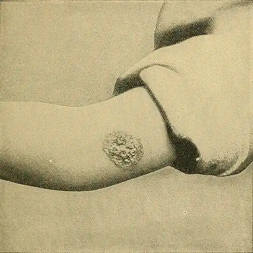 low, cup-shaped crust of the size of a pin's head will develop, which at once settles the question of diagnosis. These bright-yellow, pin-head cups multiply and by coalescence form a sulphur-colored crust which is quite characteristic (Fig. 6).