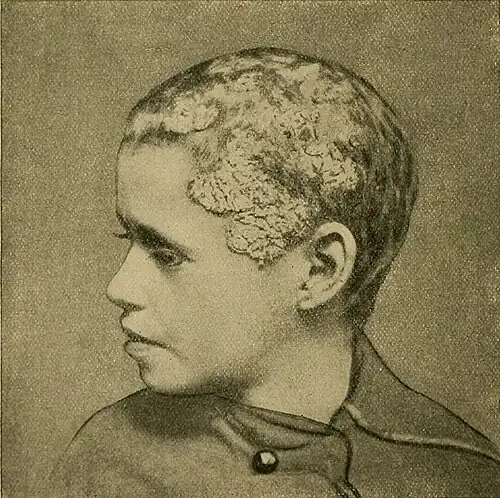 been removed, the differential diagnosis may sometimes be attended with difficulty. In ringworm, however extensive and chronic the case may be, the hair is not apt to be permanently destroyed; while in favus the pressure of the crusts which develop in the epidermic layer around the orifices of the follicles tends to produce atrophy of the hair bulbs, and in all cases of long standing a few bald, depressed, and cicatricial areas are generally observed, and upon these the hair will never grow. In chronic cases, even after the disease has been cured, a num-