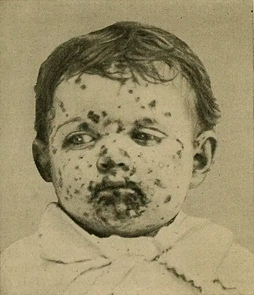 the lesions are most common, they look like recent and accidental burns. Upon the palm, where the thicker epidermis is less likely to be ruptured, the lesions are apt to present the appearance of hemispherical or flattened pustules, quite similar to, though somewhat larger than, the pustules occasionally observed in scabies. After an existence of about a week the contents of the pustules tend to dry into yellowish, honey-like or "straw-colored" crusts. If the lesions remain uninjured by the finger nails, the affected skin gradually heals and the crusts