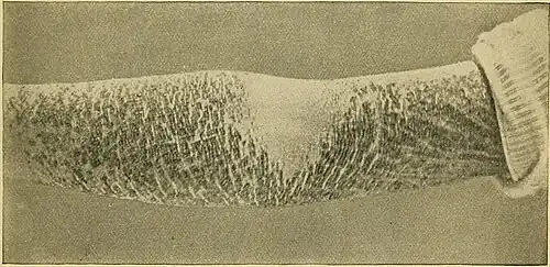 In cases of ichthyosis of a severe type in which no treatment is instituted and the ordinary use of soap and water is neglected, the epidermis becomes broken into small plates, which increase in thickness until the affected skin upon the extensor aspect of