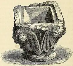 height. With the exception of (the shaft of) one found some years since in the free chapel within the castle of Hastings, I am not acquainted with any examples of the pillar piscina in Sussex, and they are everywhere uncommon. They seem peculiar to Norman architecture. The workmanship of the present specimen is very rare, and the design resembles a capital of Early English, or rather transition-Norman date. Its rough and "Ruskin-ish" character is faithfully conveyed in the engraving given above.