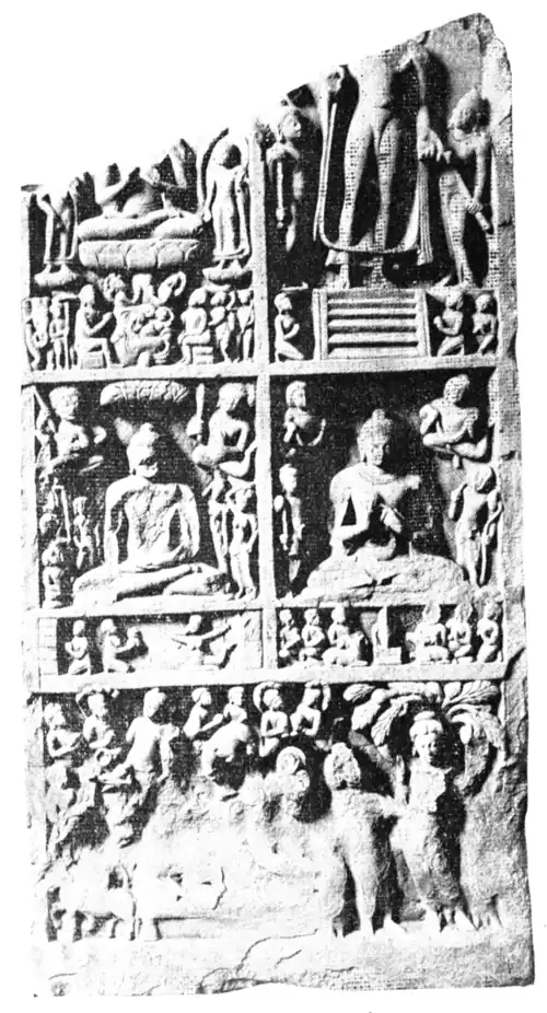 Scenes from Buddha's life (1)a. Maya's dream, b. Birth of Buddha, c. the first bath, (2) the Sambodhi, (3) Dharma-cakra-pravartana, (4) The Miracle of Sravasti and (5) Devavatara, from Sarnath, Benares (Indian Museum No. S. 1.)
