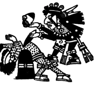 A human sacrifice From an ancient MS. covered with hieroglyphic scrolls of mystic import. They led him to the sacrificial stone, a huge block of jasper, with its upper surface somewhat convex. On this the prisoner was stretched. Five priests secured his head and his limbs; while the sixth, clad in a scarlet mantle, emblematic of his bloody office, dexterously opened the breast of the wretched victim with a sharp razor of itztli,— a volcanic substance hard as flint,—and, inserting his hand