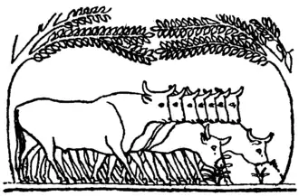 the muzzle encircled with black or brown hairs. Black or brown patches are sometimes found on other parts of the body and, frequently, below the knee. The extraordinary resemblance between the English park cattle and the cattle of