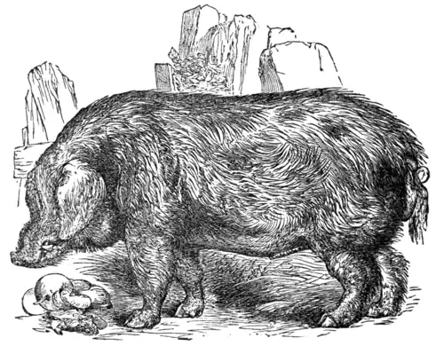 The original breeds of this country are now rapidly losing all traces of individuality under the varied systems of crossing to which they are subjected. Formerly they might have been divided into two principal classes, the small and the large breeds: the former having ears tending to the upright, being dusky in hue, and greatly resembling the wild boar in form; and the latter being long-bodied,