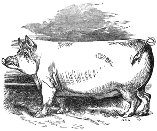 The most esteemed Essex breeds are entirely black, and are distinguished by having small teat-like appendages of the skin depending from the under part of the neck, which are commonly termed wattles. Some of these animals will attain the weight of 480 lbs., but they are not, according to some breeders, quick fatteners; while others prize them for their rapid growth and aptitude to lay on flesh, as well as for its excellence; it forms small and delicately-flavored pork. Lord Western has been the great improver of the Essex pigs, and his breed is highly esteemed throughout the kingdom.