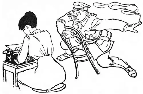 War Correspondent, (dictating to his stenographer): I am sitting in a captured trench, astride an Austrian gun. Dense smoke envelops me. A little to one side, a machine gun is clicking rapidly...