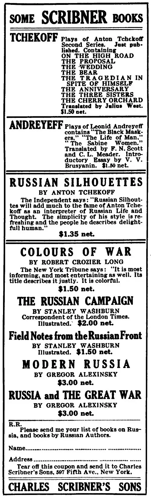 Charles Scribner's Sons have published the second volume of Stanley Washburn's "Field Notes from the Russian Front." This volume is called "The Russian Campaign" and covers the period from April to August, 1915, i. e., practically the period of the German drive, which culminated in the occupation of Warsaw. The two volumes together form a highly interesting and graphic account of the Russian military fortunes during the first period of the War.