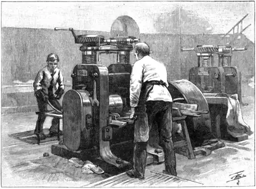 This is the Rolling-room. The metal, it must be understood, is far from hard, and the reduction of the thickness and consequent increase in the length, due to the rolling of the bars, are not so difficult a matter as to the uninitiated they may seem. The bars are placed between adjustable cylinders and rolled into strips, or "fillets" as they are called.